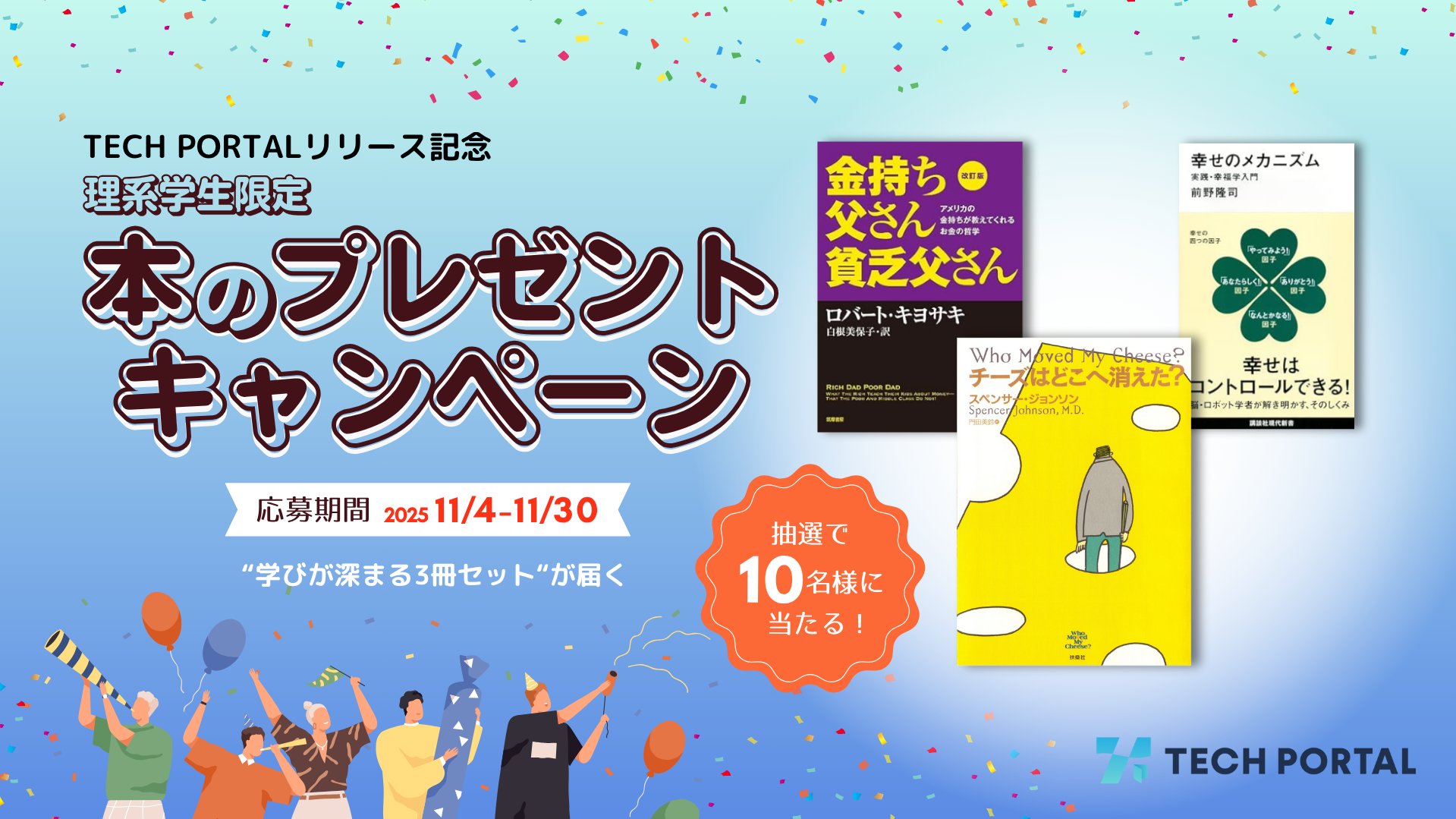 TECHPORTALのリリースを記念して 抽選で10名の理系学生に、学びを広げる3冊セットをプレゼントします📚 あなたの「これから」を考えるきっかけになる本をお届けします。