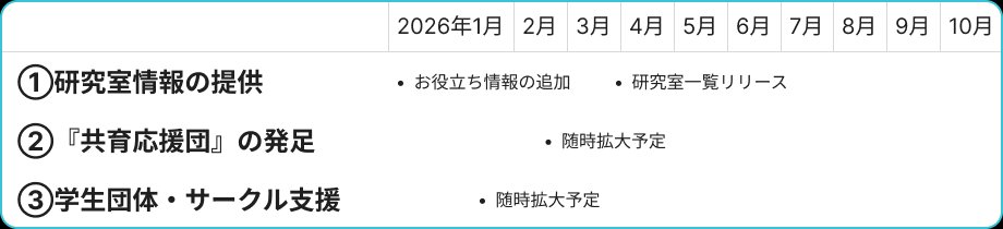 AさんやBさんのような研究室にまつわる悩みを持つ学生の手助けとなるエリアを新設予定です。
