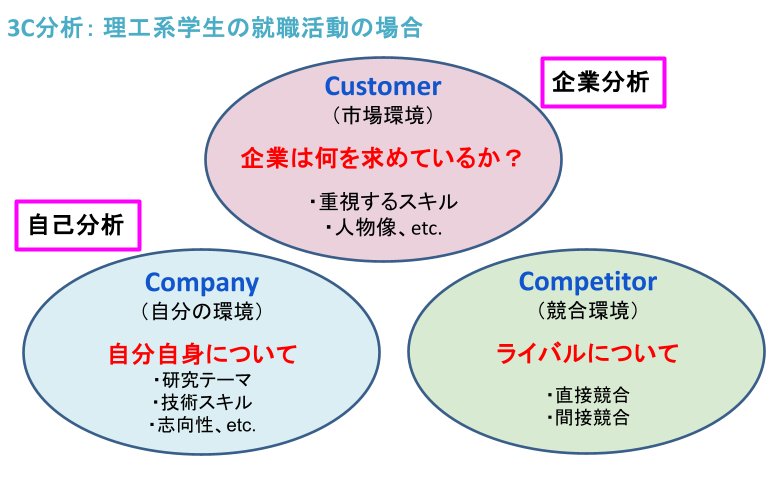 これは企業のマーケティング戦略立案で最も基本的なフレームワークの一つで、Customer(顧客・市場)/Company(自社・自分)/Competitor(競合)の3つの視点から市場を分析する手法である。
