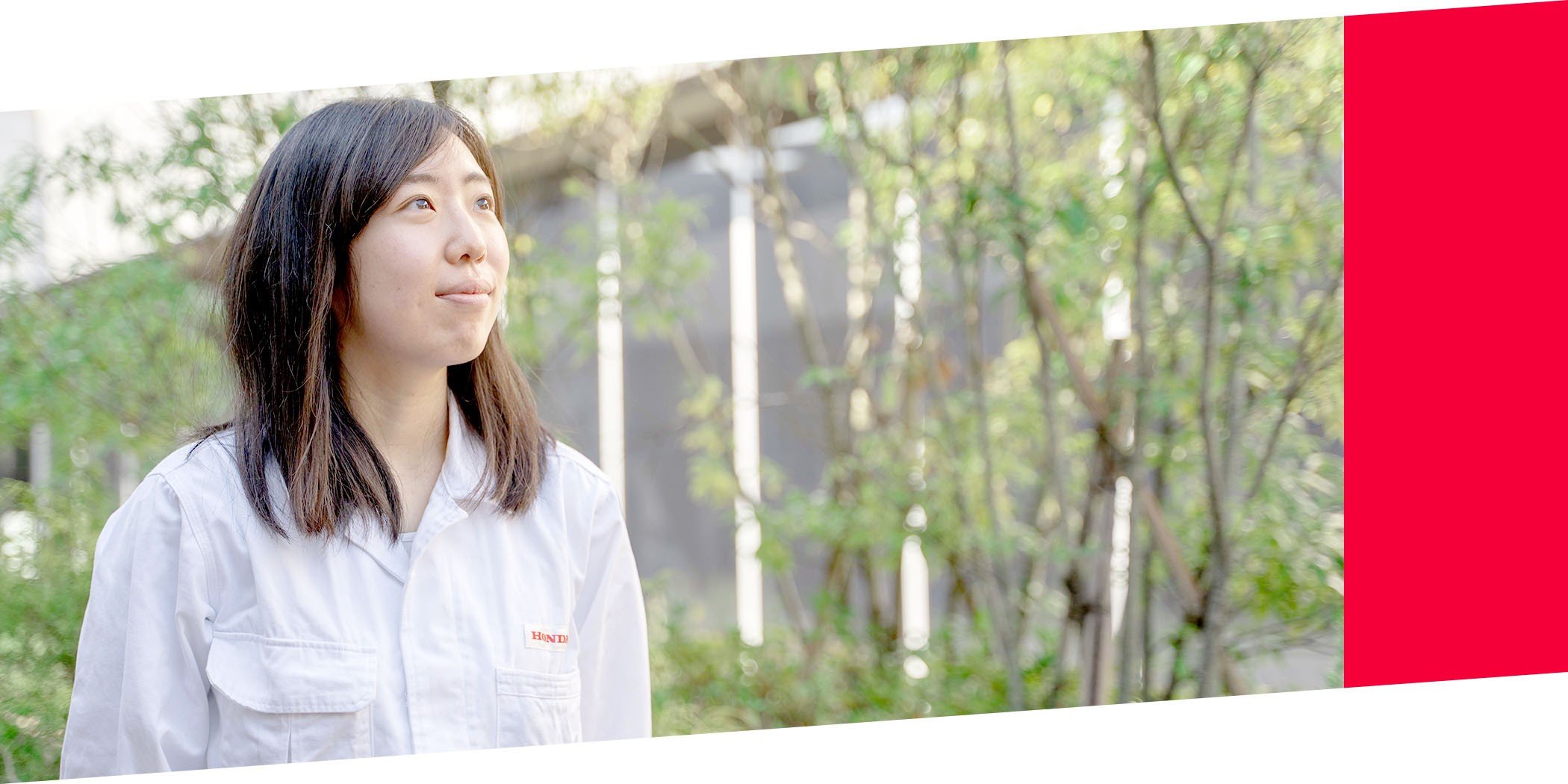 きっかけは、目の病気にかかってしまった高校時代の友人が「クルマが一番怖い」と言っていたこと。 この言葉を聞いて、社会から交通事故をなくすことが私の夢になりました。 まずは現在の仕事で結果を残すことが大切ですが、いつかはHondaでクルマの研究に携わり、 より多くの人が安心して暮らせるようなクルマ社会を実現していきたいと考えています。 自分にできることは、まだまだたくさんあると考えています。