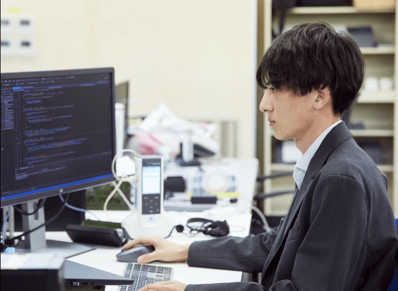 現在のメインの業務。自身のデスクで新製品の組み込みソフトの開発を行っている。