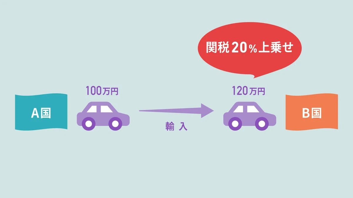 関税を、輸入品に課される消費税のようなものと考えてみます。例えば、日本の自動車メーカーがアメリカへ輸出する場合、船で運んでアメリカに到着した時点で、車に関税が課されます。税率は国や品目によって決まっていて、現地での販売価格に上乗せされます。
