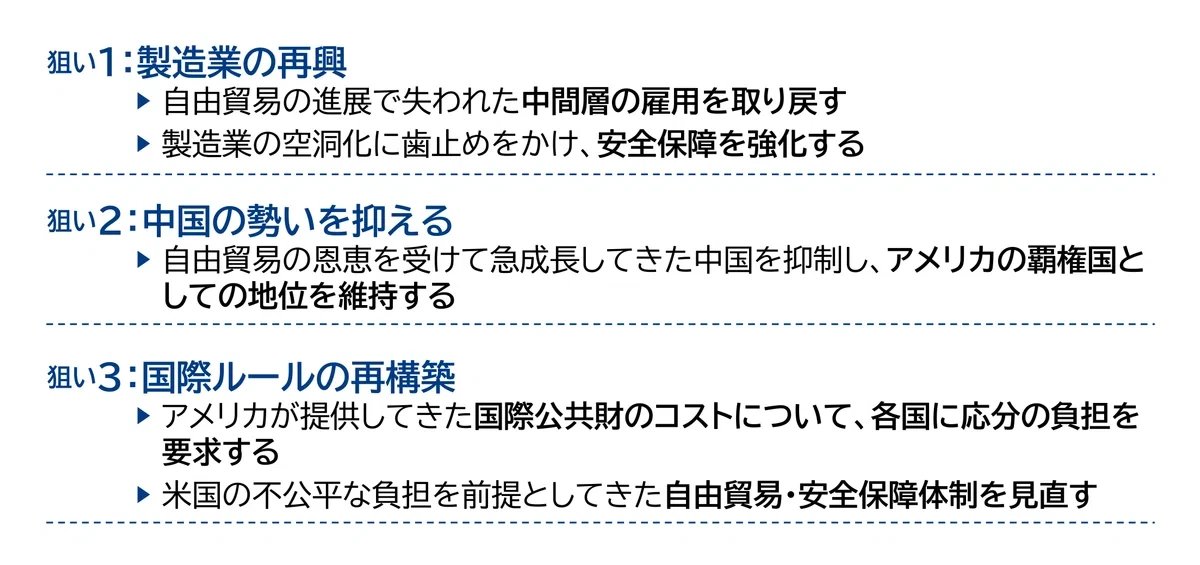 トランプ関税の意図はどのようなところにあるのか?三菱総合研究所 政策・経済センターでアメリカ経済を研究する淺井優汰さんは「狙いは大きく3つあり、いずれもアメリカが抱える根深い課題と密接に関係する」と話します。
