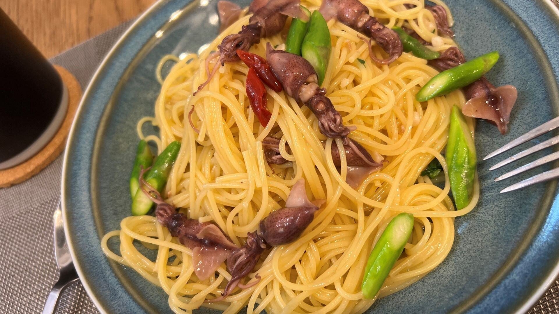 ランチタイム。パスタを作って食べることが多い