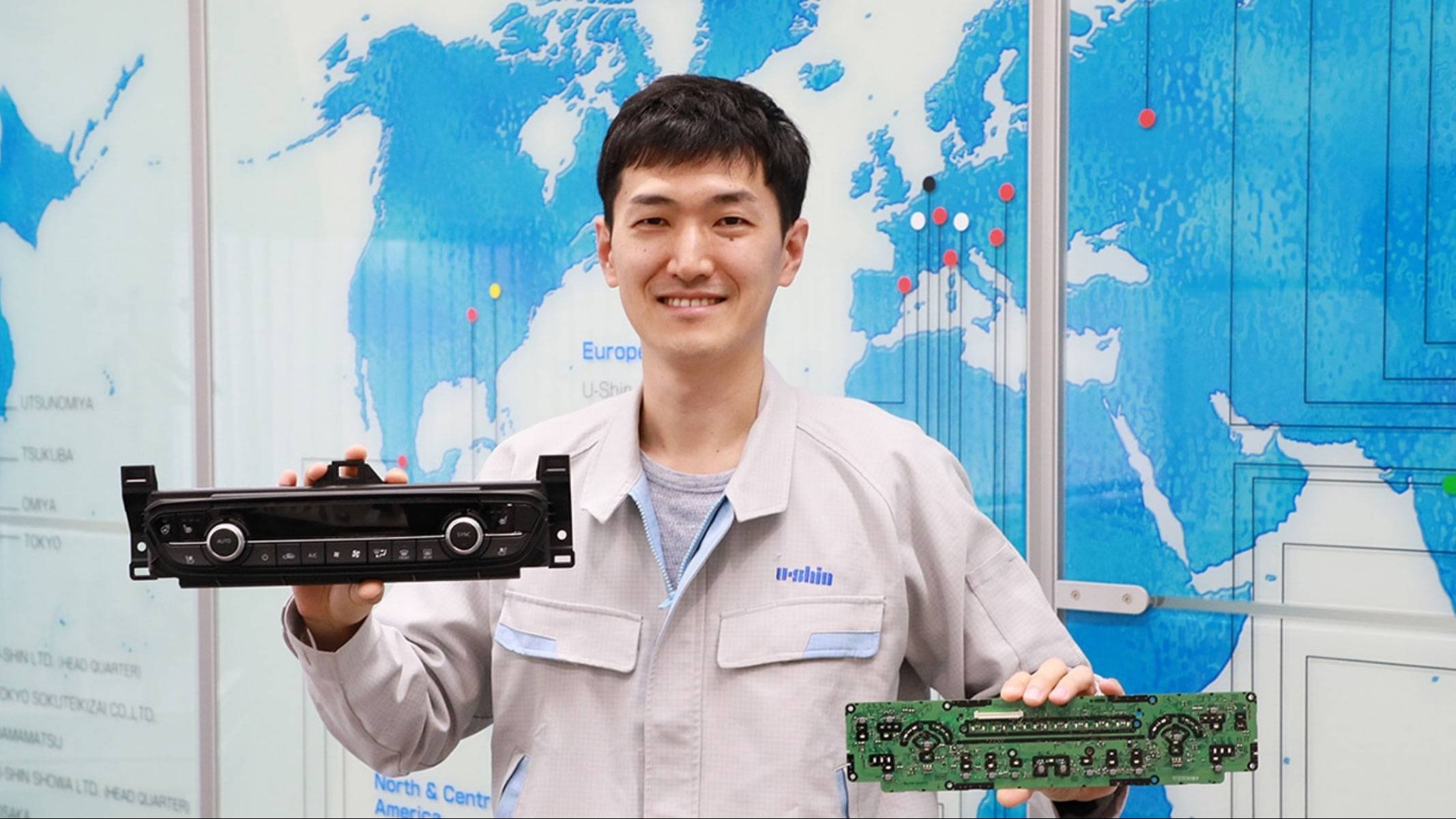 エンジンスタートスイッチとエレキシフターの開発を担う部署で、ハードウェアの設計を担当しています。具体的には、回路設計や基板設計から電子部品の選定、図面の作成、設計検証テストまでが私の仕事です。部内には、システム設計やソフトウェア設計、機構設計を担当するチームもいて、現在取り組んでいるミッションでは、機構設計チームと共にエンジンスタートスイッチの小型化と低コスト化の実現を目指しています。