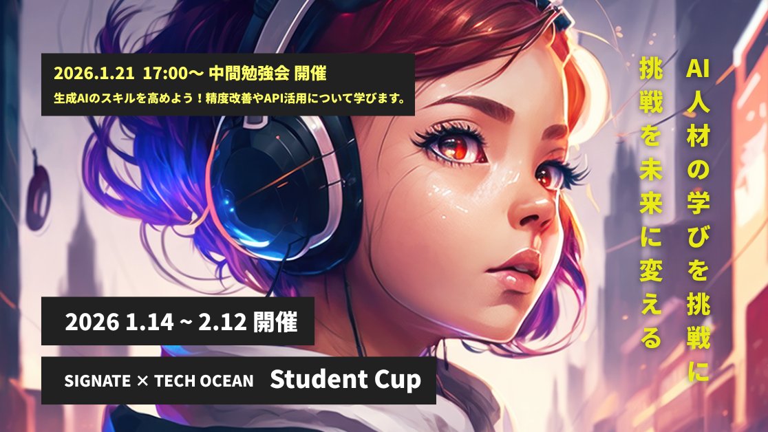 学生No.1データサイエンティストを決めるデータ分析コンペティション「SIGNATE × TECH OCEAN Student Cup 2025」を開催中!上位入賞者には賞金あり。1か月をかけて優秀な学生同士で協力しながら競い合おう。