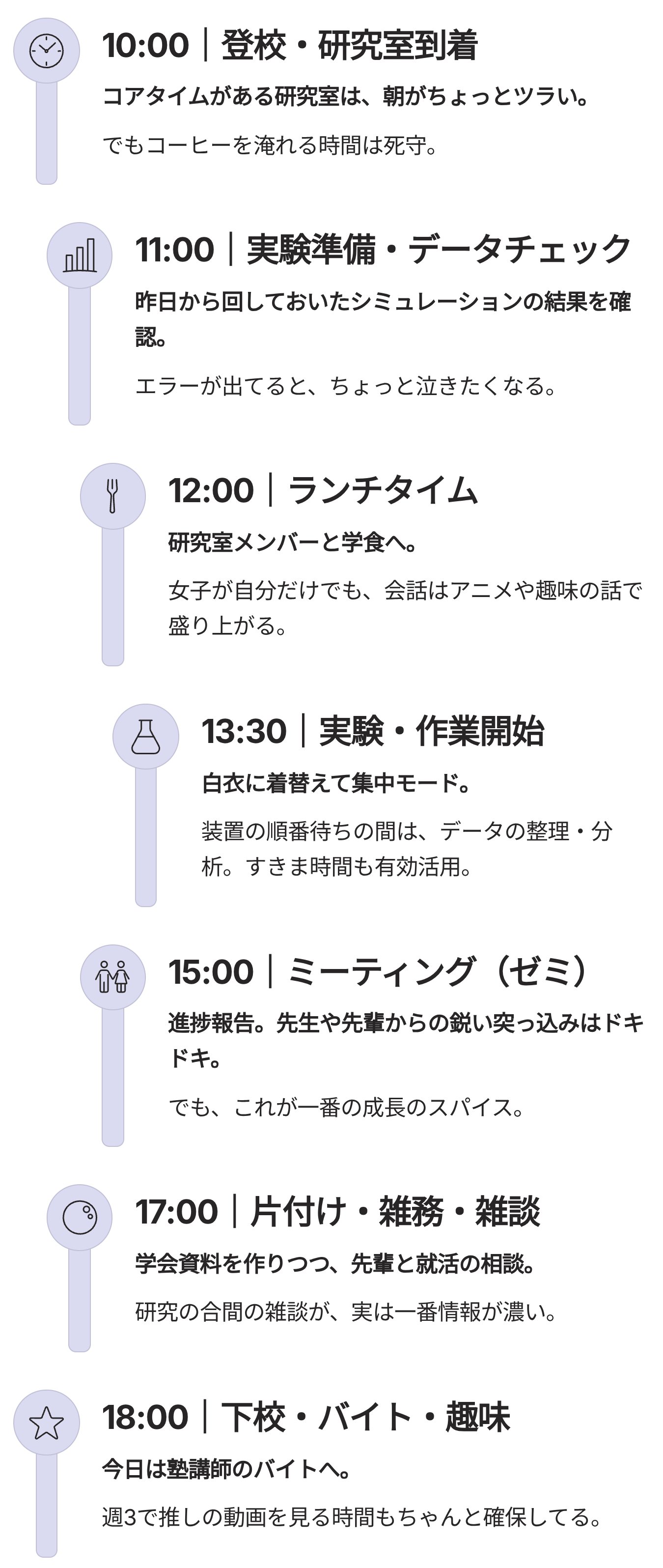 🎨 バイト・趣味: 研究室以外の世界を持つことで、社会との接点や新しい学びのチャンスにも。