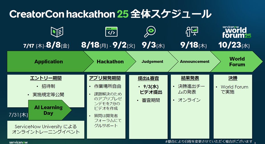 ServiceNow社が主催しているServiceNowの機能やAPI、AIなどを活用し、実際に役立つ業務アプリを開発するコンテストイベントです。