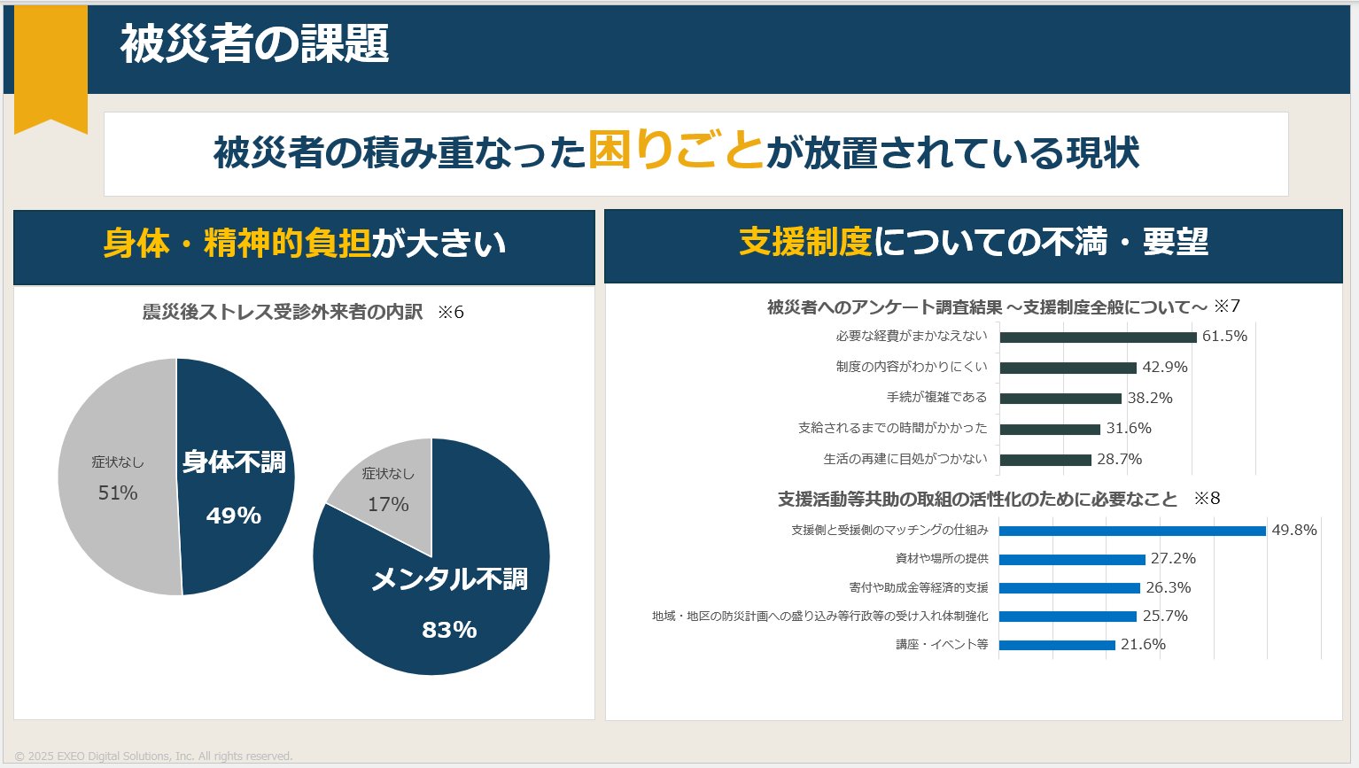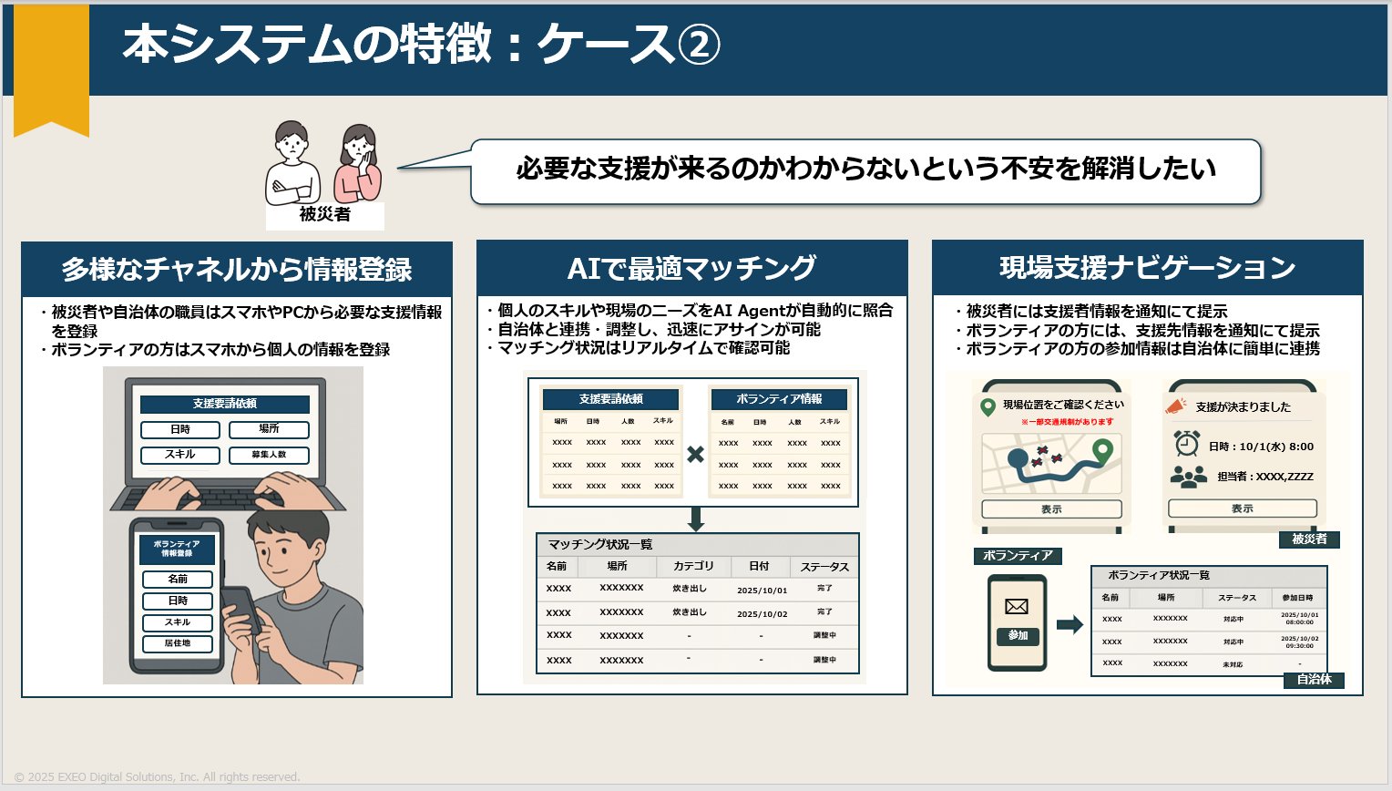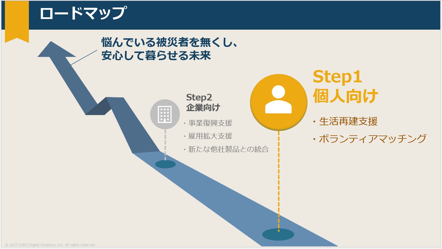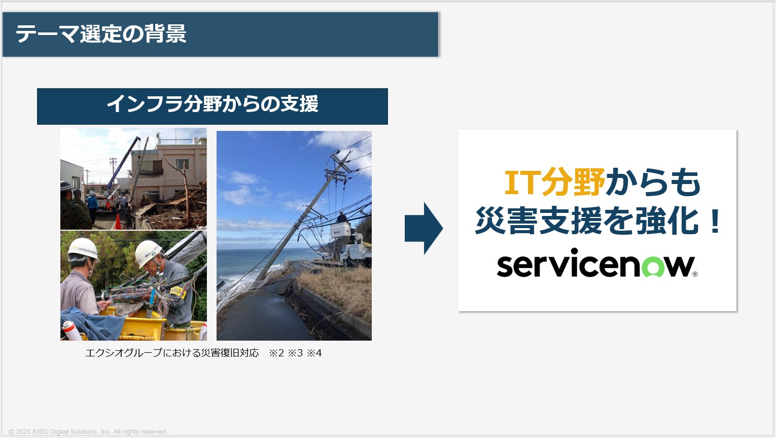私たちが課題として災害をテーマに選んだ背景には、メンバー自身の被災経験があり、支援のありがたさを身をもって感じたことが大きく影響しています。エクシオグループとしては回線復旧や住宅工事などの災害支援を行っていますが、IT分野からのアプローチも強化し、エクシオ・デジタルソリューションズならではの新たな災害支援を提案したいと考えました。
