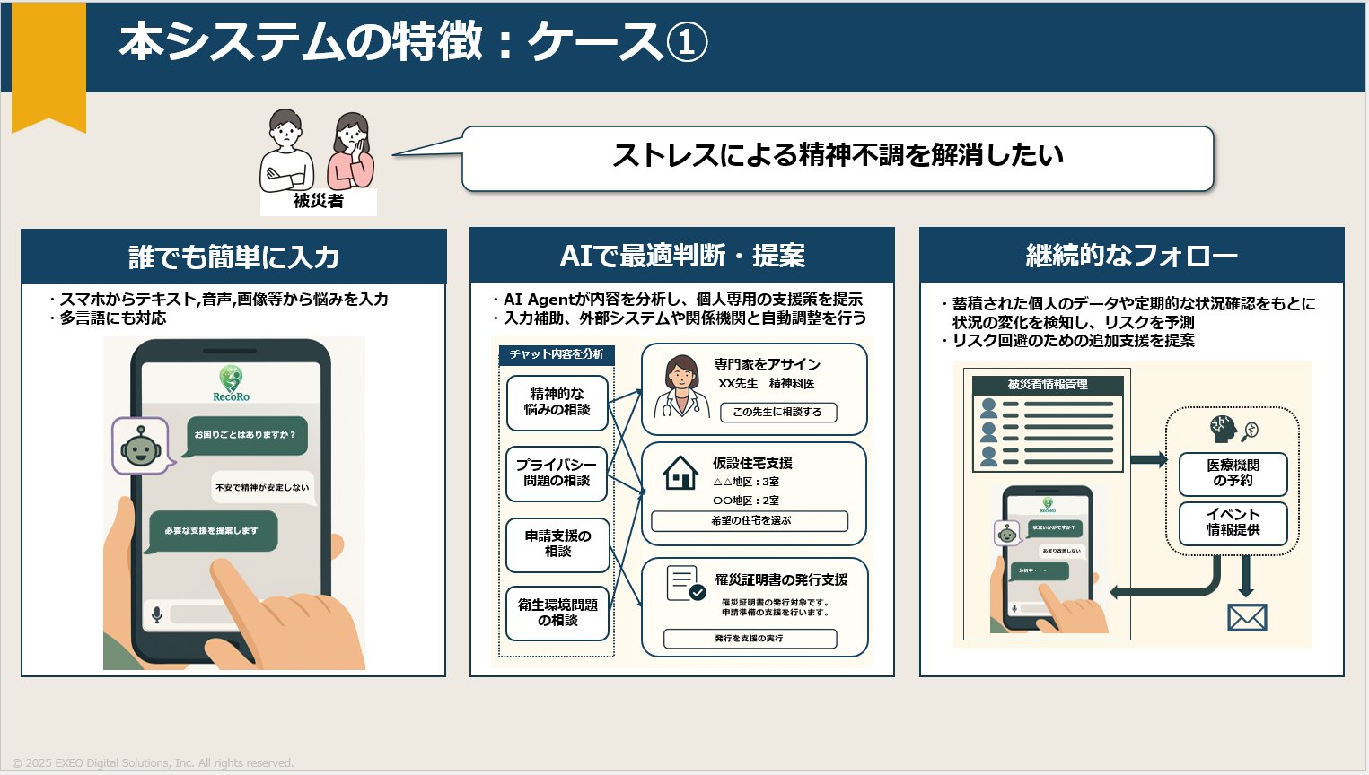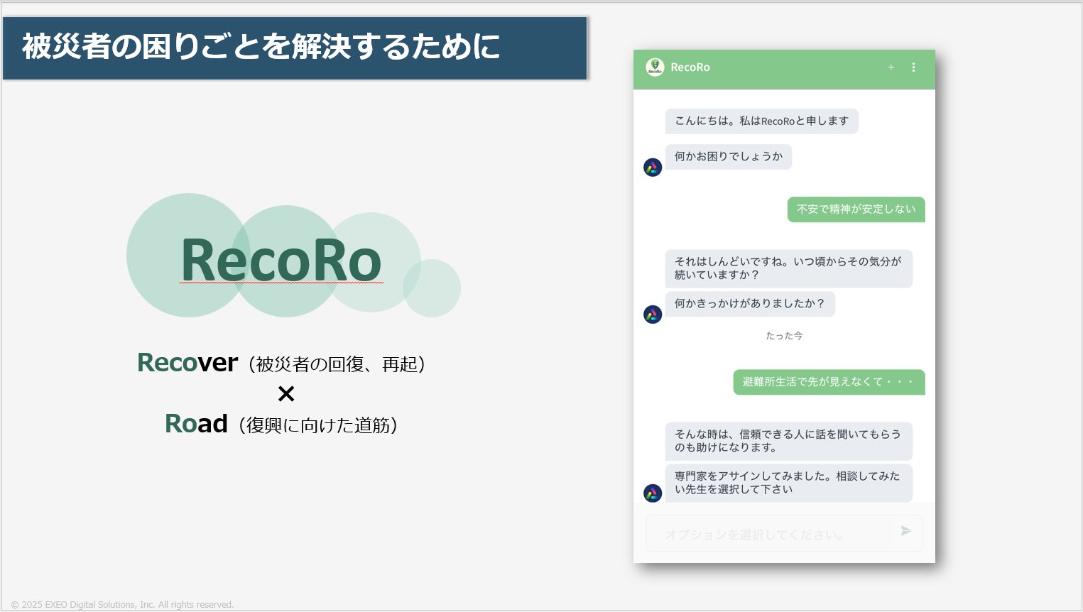 私たちはRecoRoというServiceNowとAI Agentを活用し、被災者一人ひとりの不安や悩みに合わせた適切な支援を自己判断し、提案するシステムを実装したアプリケーションを提案しました。